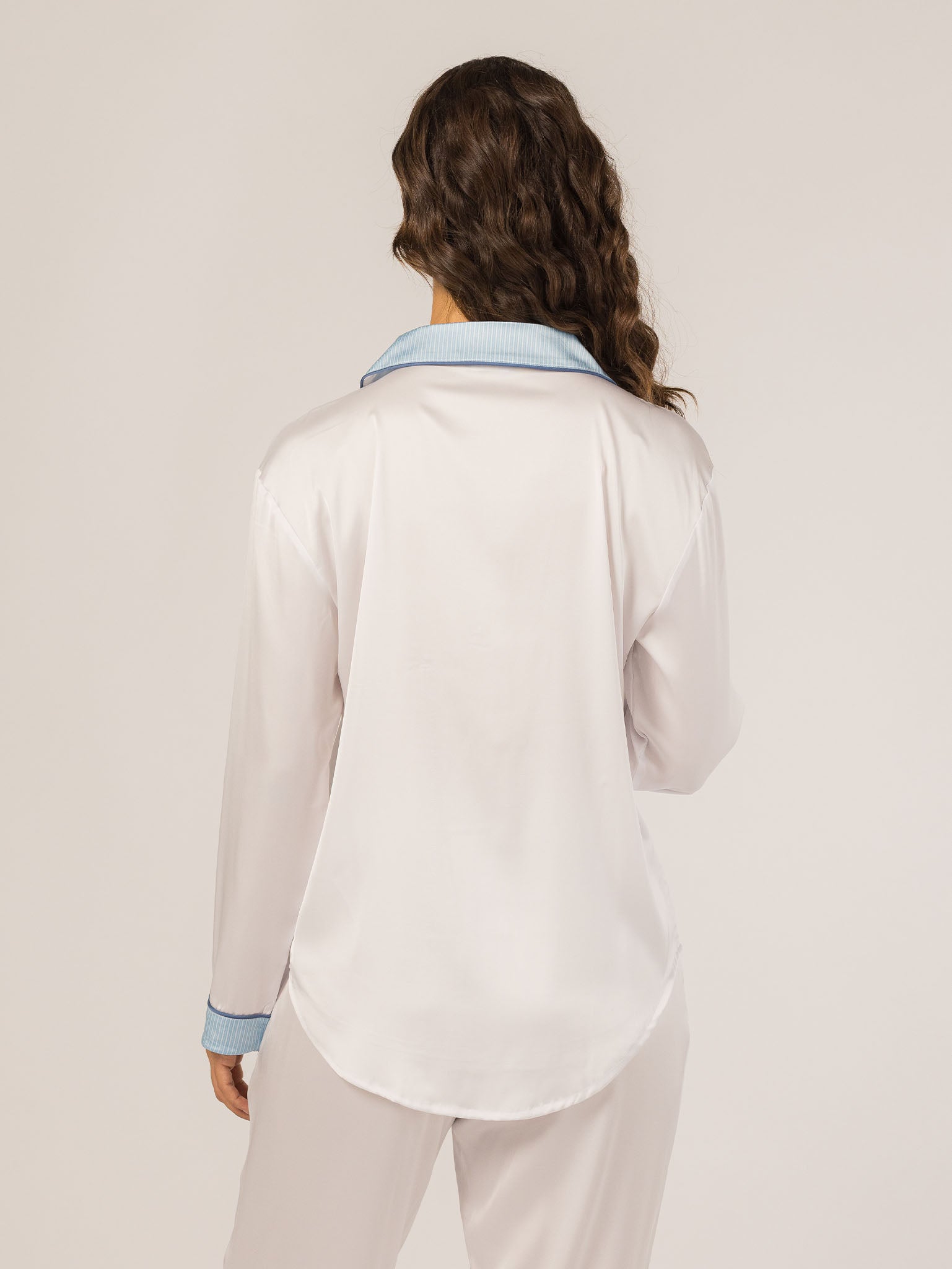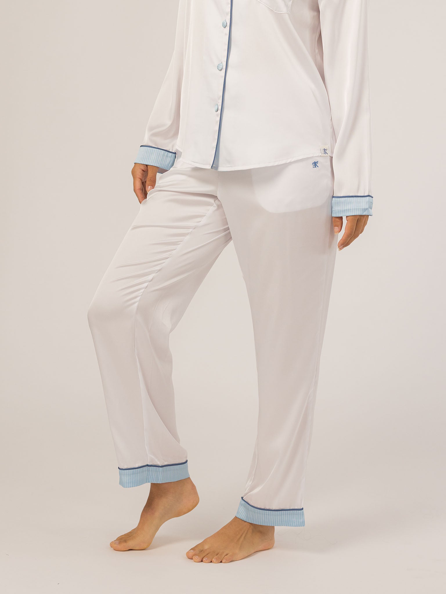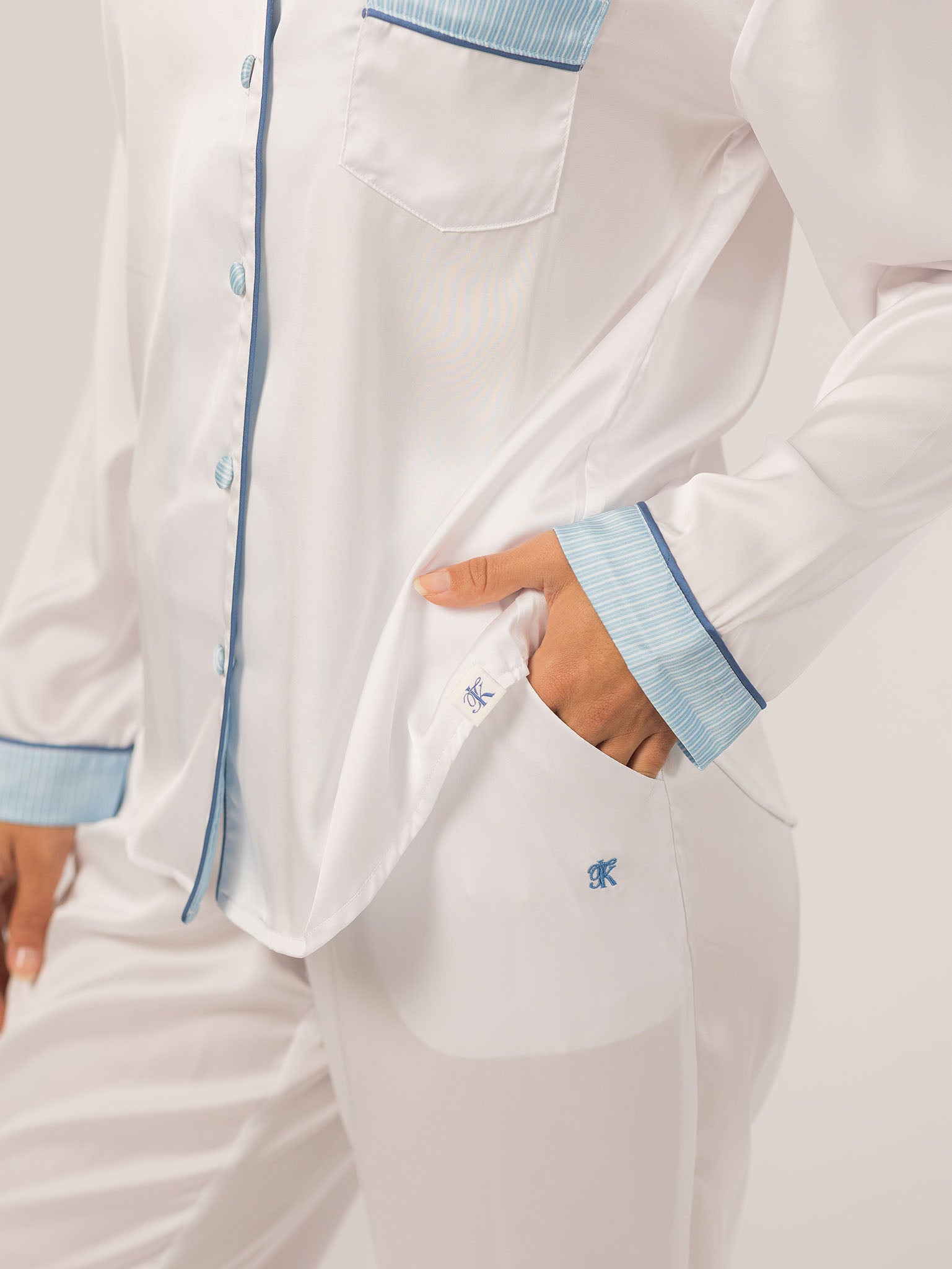 The Grace PJ Long Sleeve Set is my nighttime luxury essential. Made from our silky-soft Grace fabric, it has a smooth, elevated feel with just the right weight. With a classic button-up top, chest pocket, and straight-leg pants finished in contrast piping—this set feels like pure glam, even when you’re just lounging. – Keleigh ♡