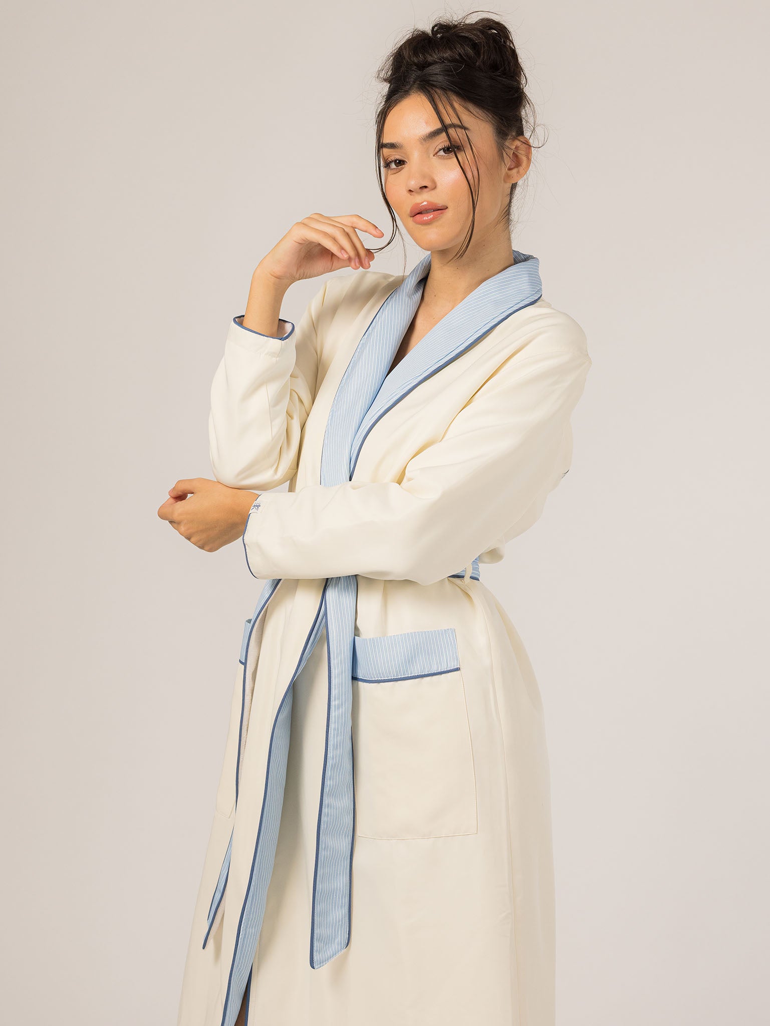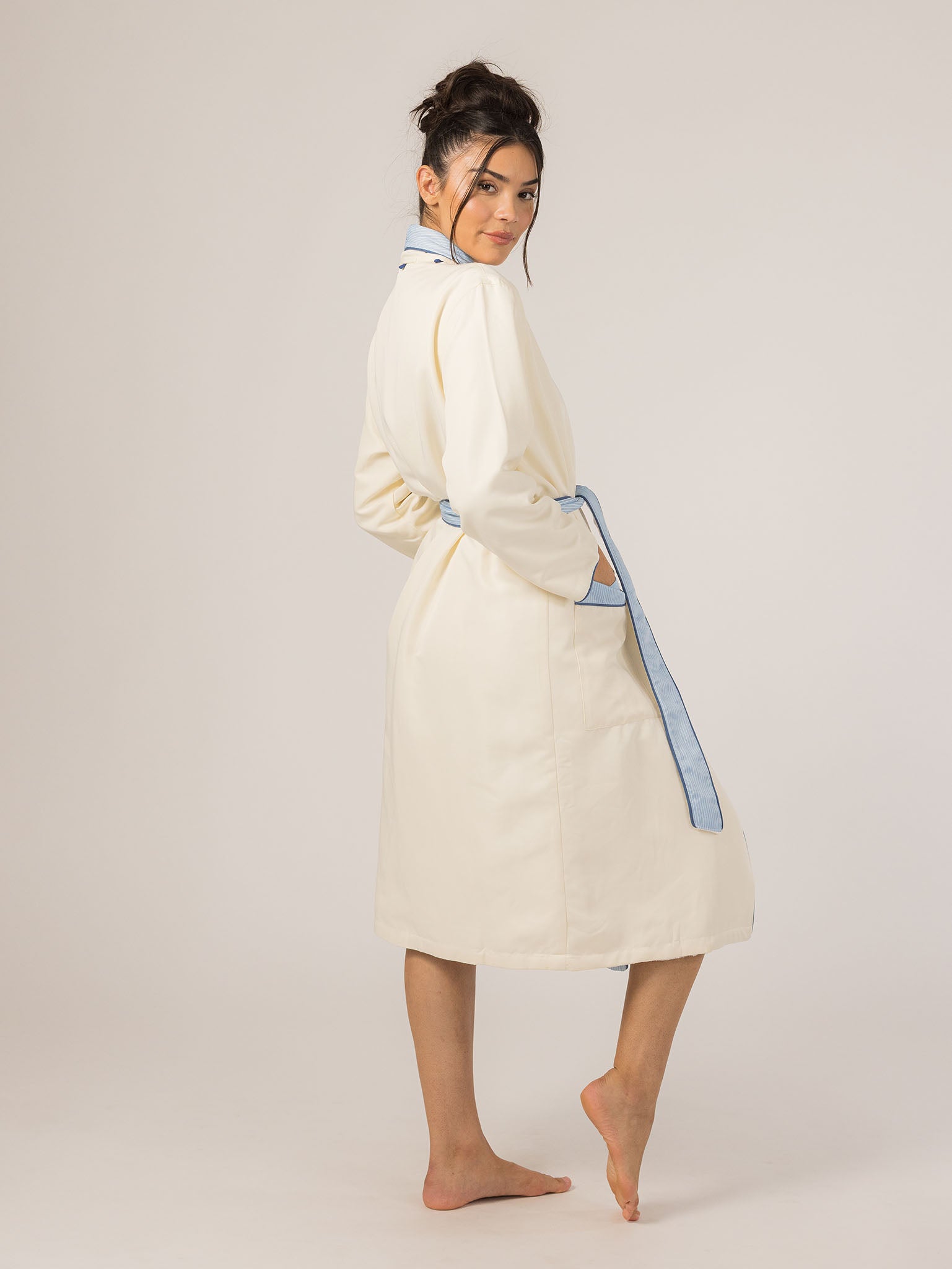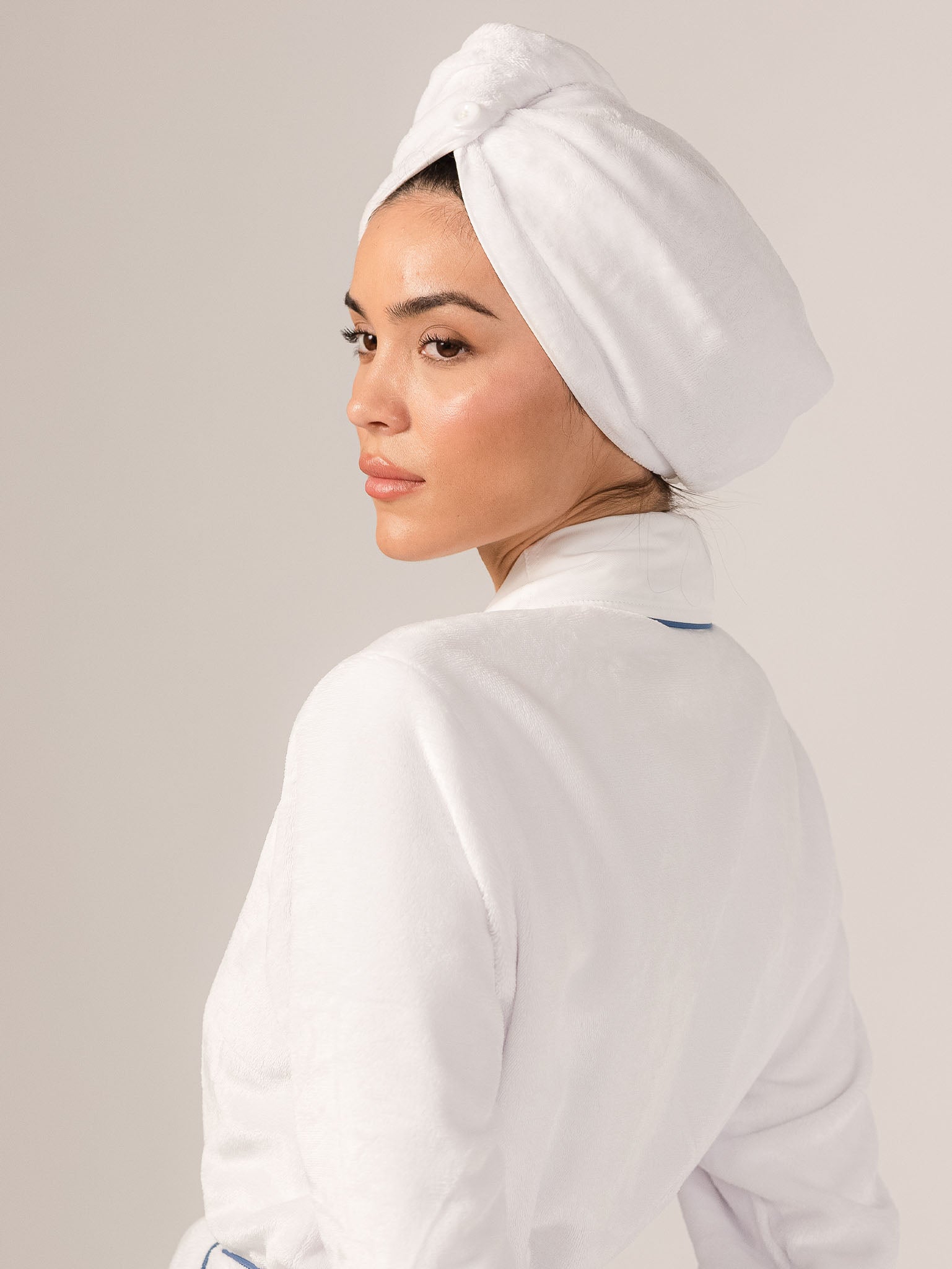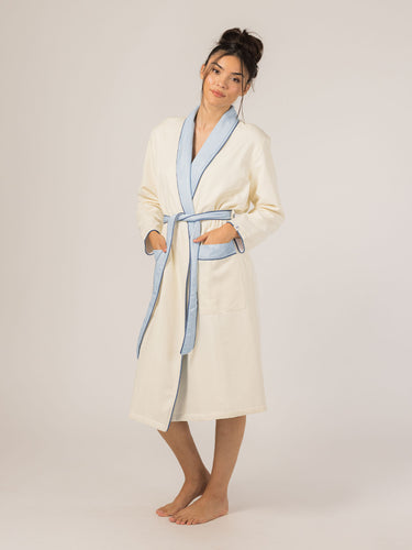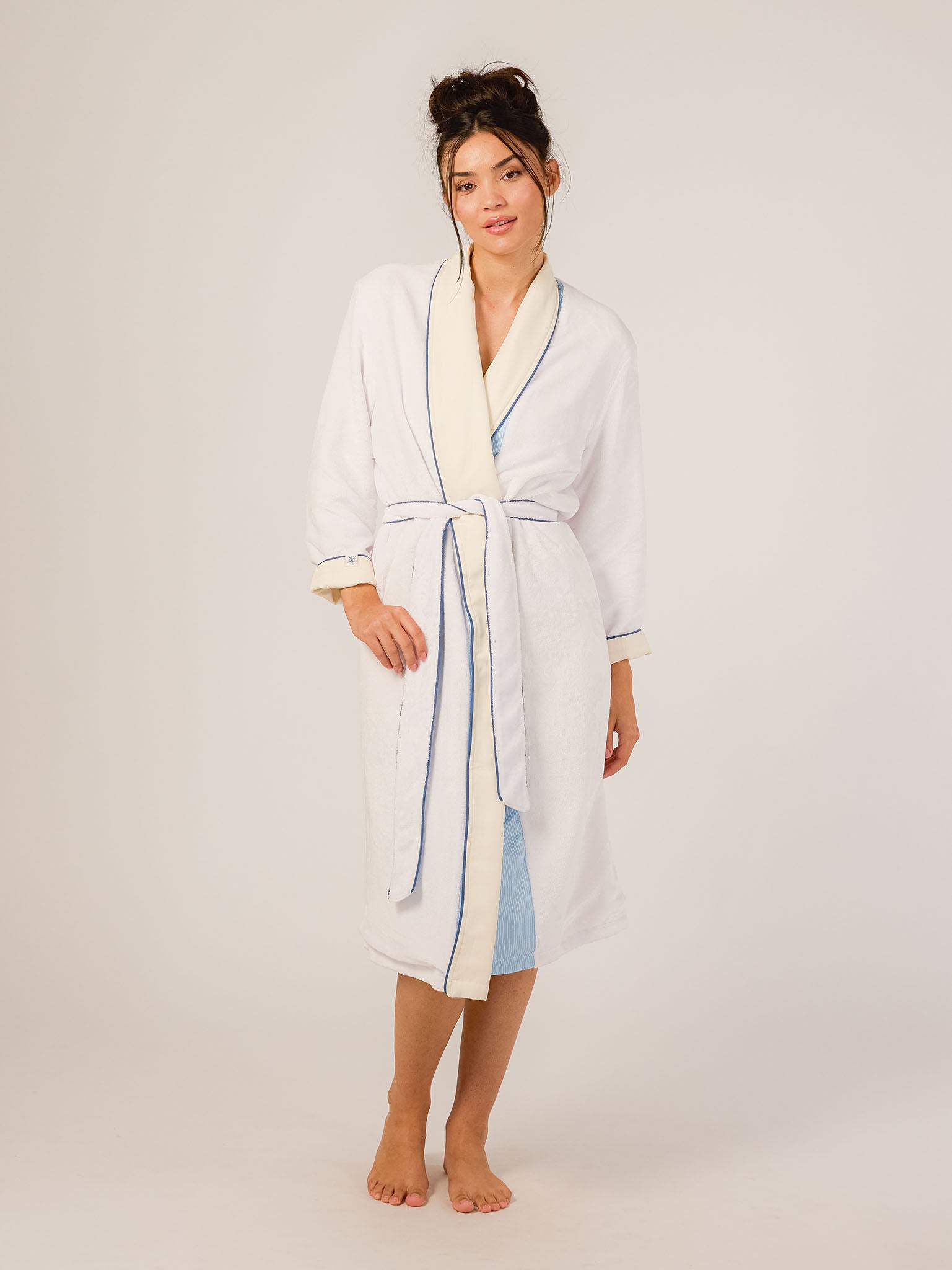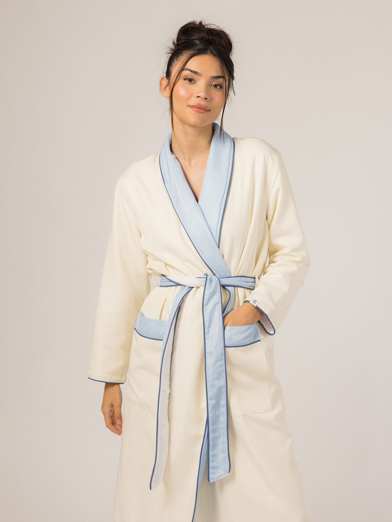 The Leona Reversible Robe is my everyday luxury must-have. One side feels like a silky down comforter, the other like the softest spa towel—so you always get the best of both worlds. With a chic pine-stripe lapel and cozy wrap tie, it’s the robe I never want to take off. – Keleigh ♡