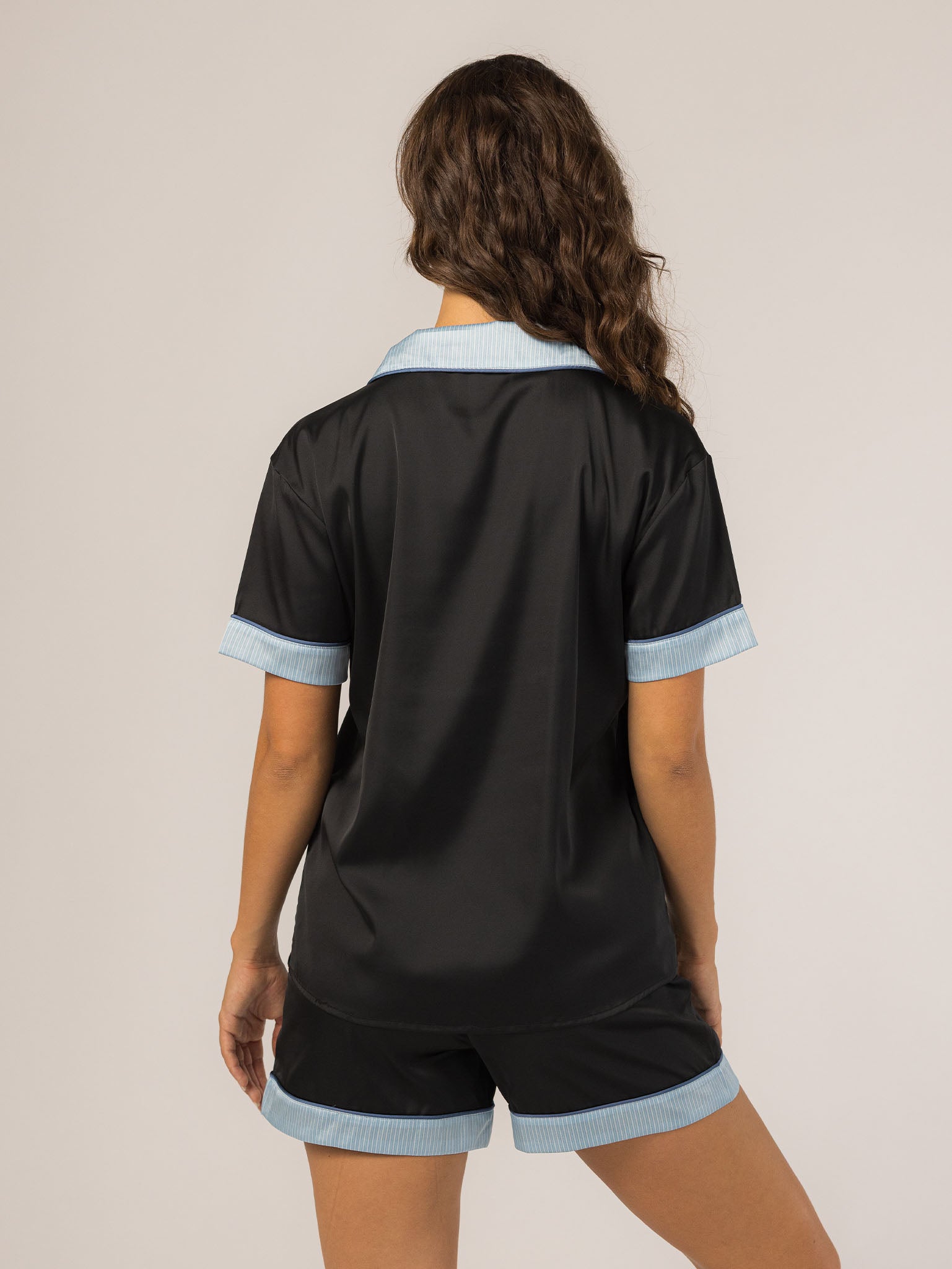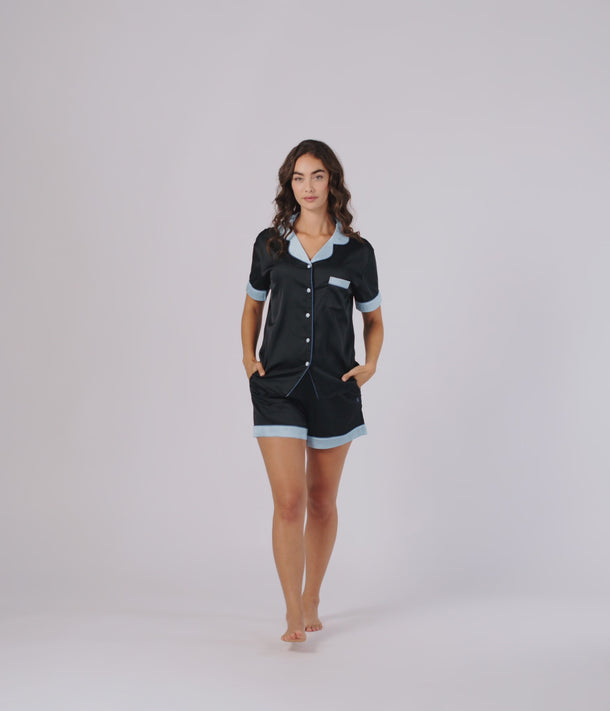 The Grace PJ Short Sleeve Set is my go-to for feeling polished and cozy. Crafted from our luxe, silk-like Grace fabric, it’s smooth, breathable, and beautifully draped. Featuring a short sleeve button-up top and matching shorts with contrast piping—this set brings a little glam to your everyday unwind. Effortless elegance, always. – Keleigh ♡