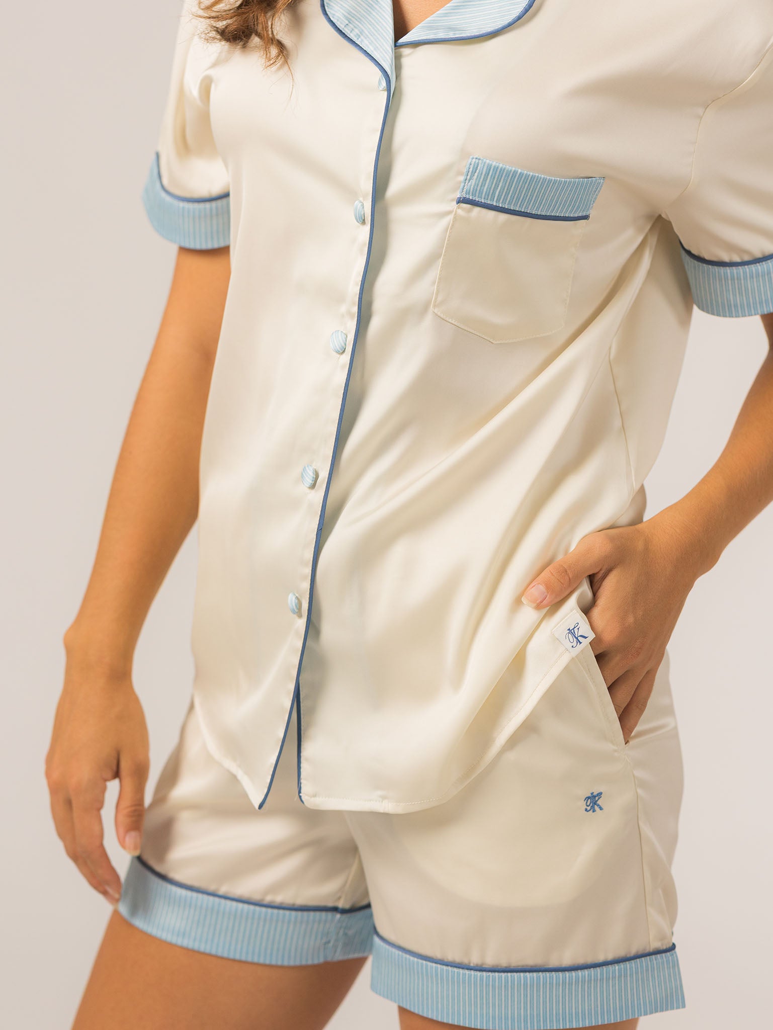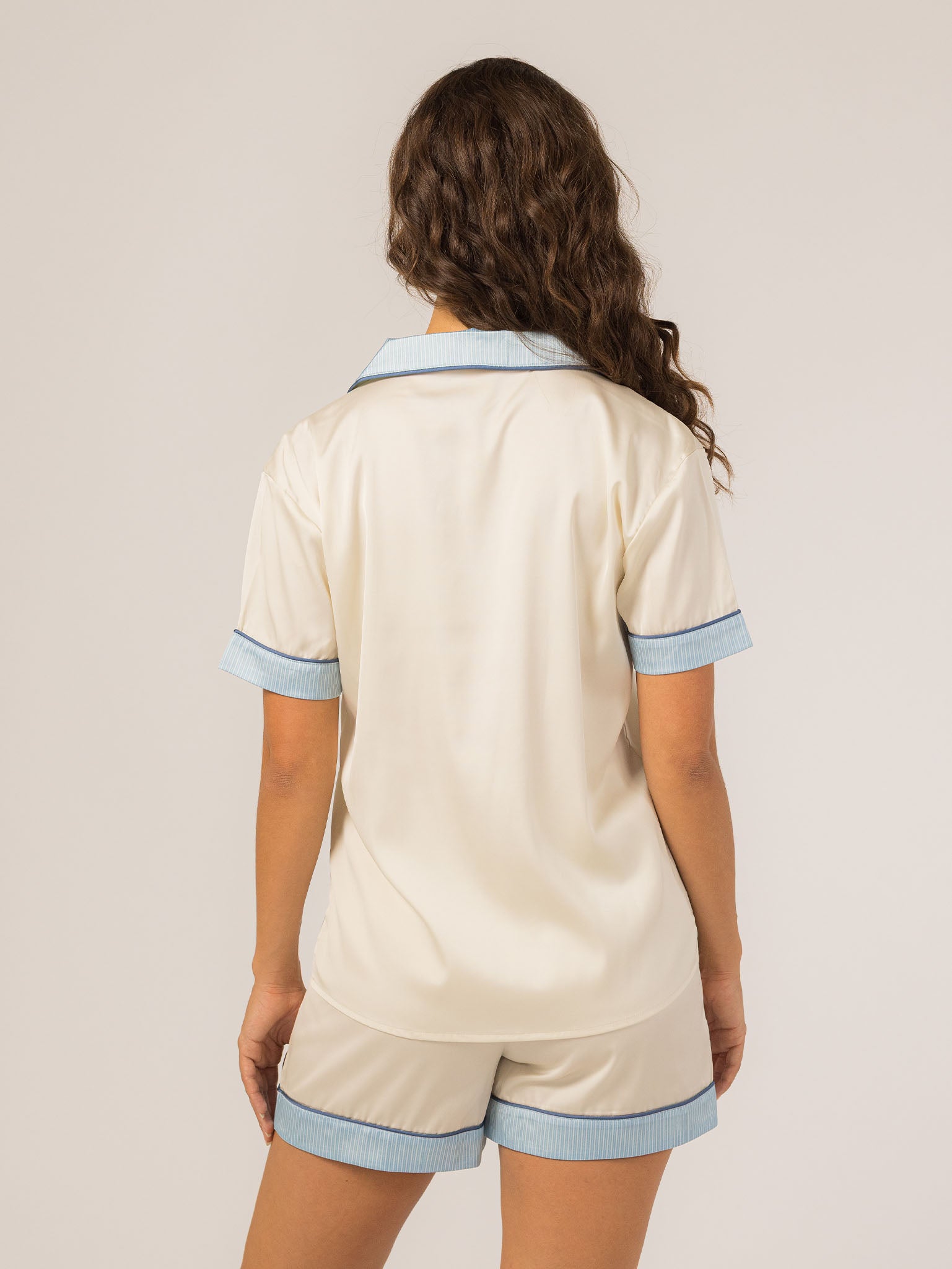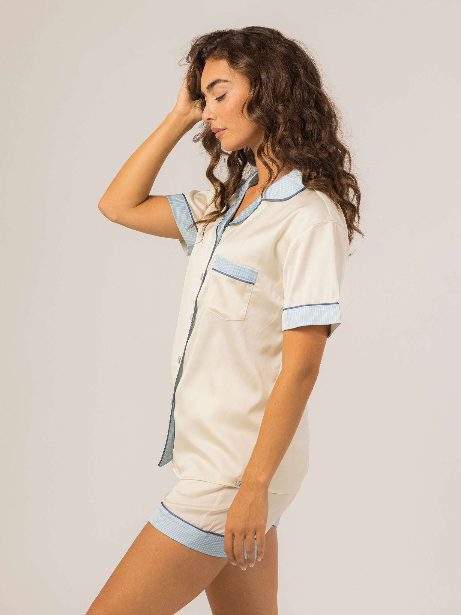 The Grace PJ Short Sleeve Set is my go-to for feeling polished and cozy. Crafted from our luxe, silk-like Grace fabric, it’s smooth, breathable, and beautifully draped. Featuring a short sleeve button-up top and matching shorts with contrast piping—this set brings a little glam to your everyday unwind. Effortless elegance, always. – Keleigh ♡