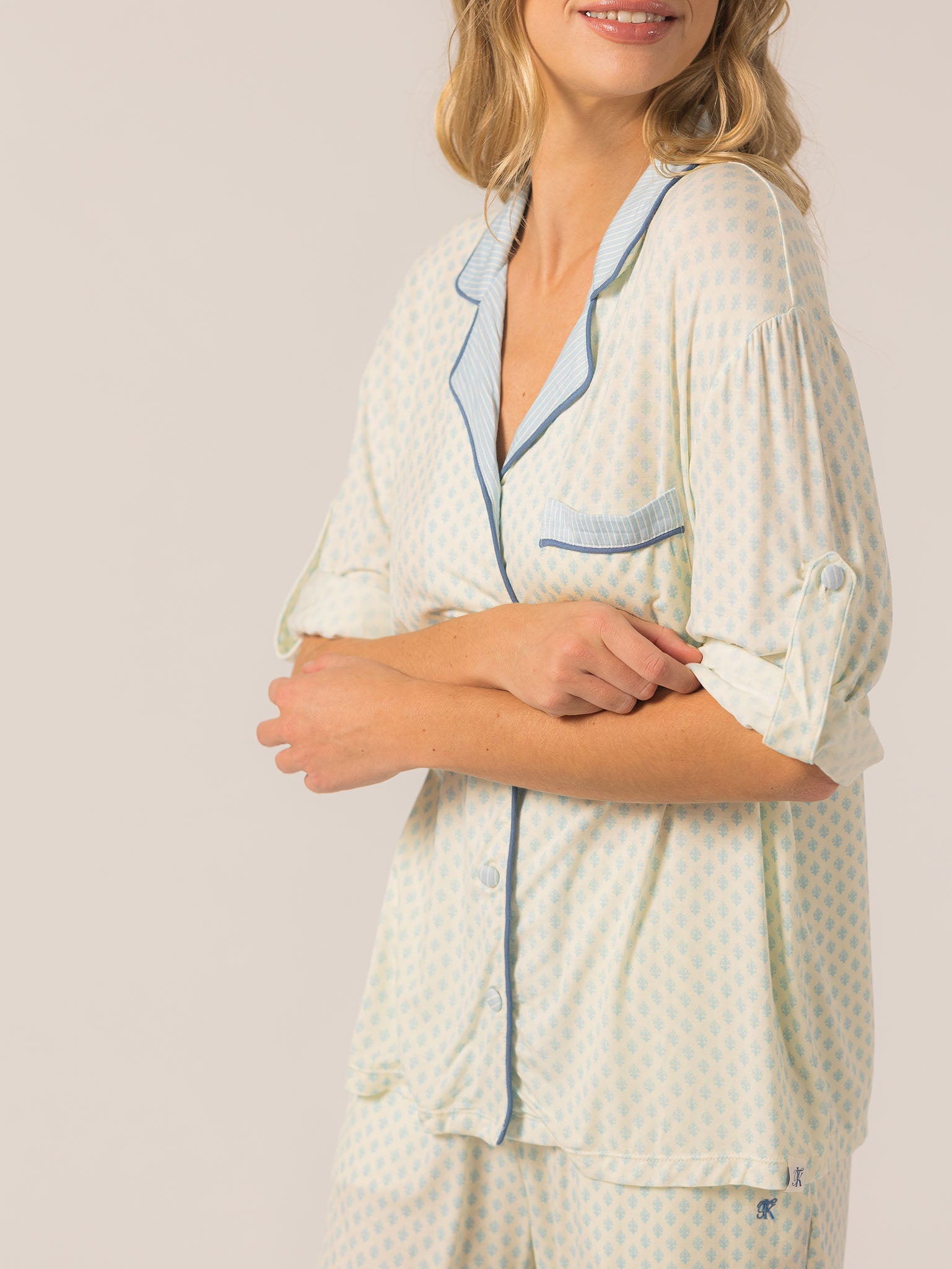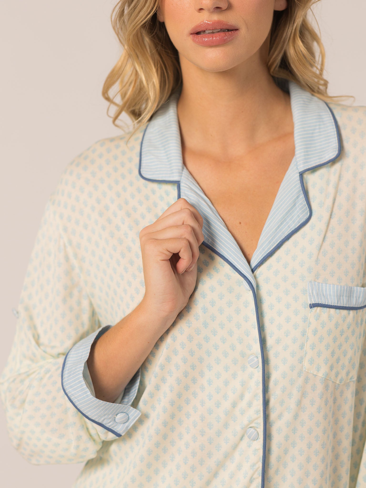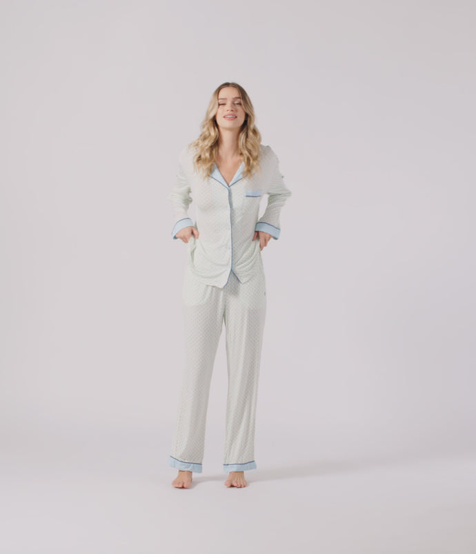 Slip into effortless luxury with the Rose PJ Long Sleeve Set. Made from our signature ultra-soft Rose fabric, this breathable set features a classic button-up top with chest pocket and straight-leg pants with contrast piping and an adjustable waistband. It’s lightweight, cozy, and elevated—just how I like to unwind. – Keleigh ♡