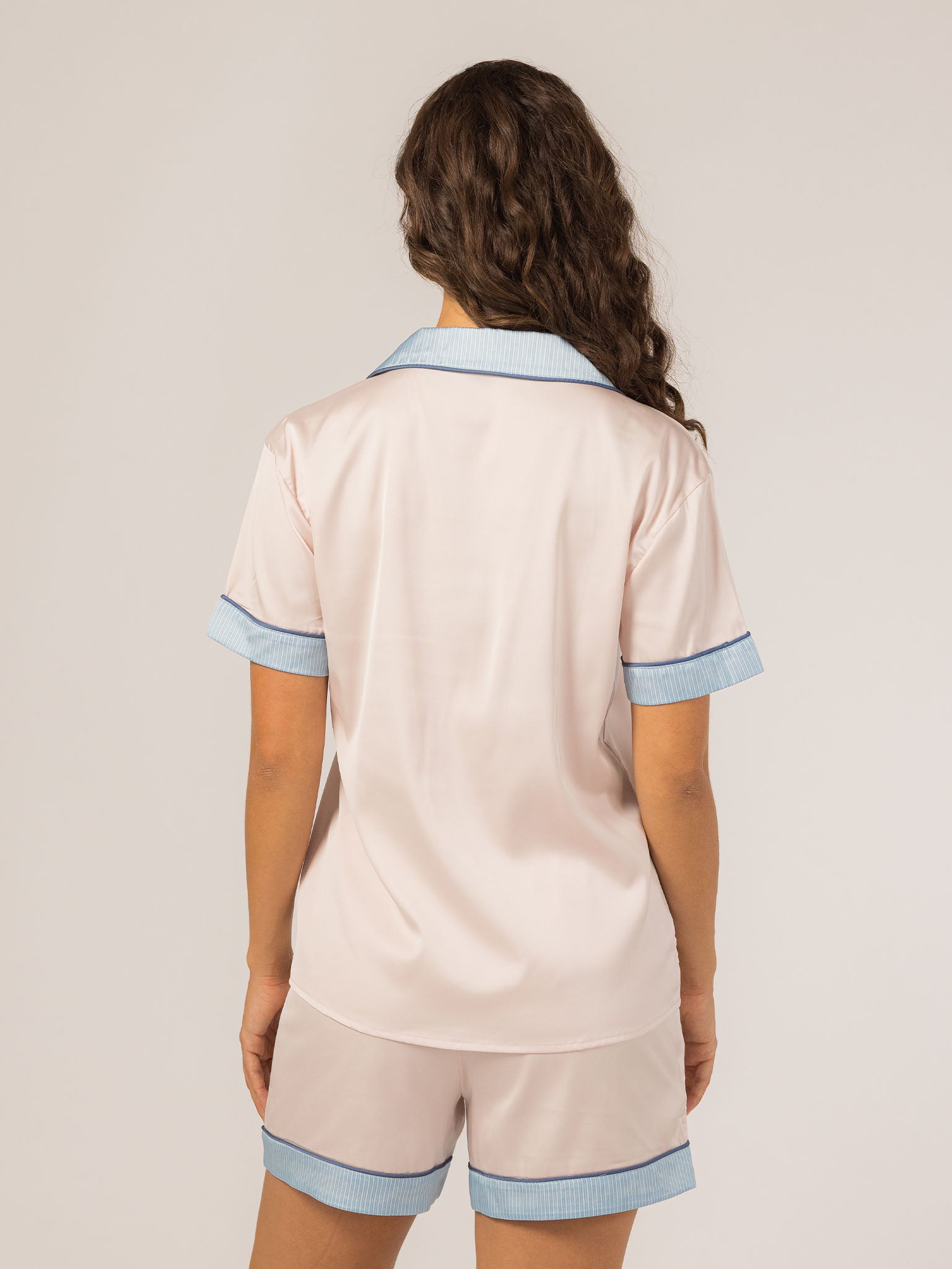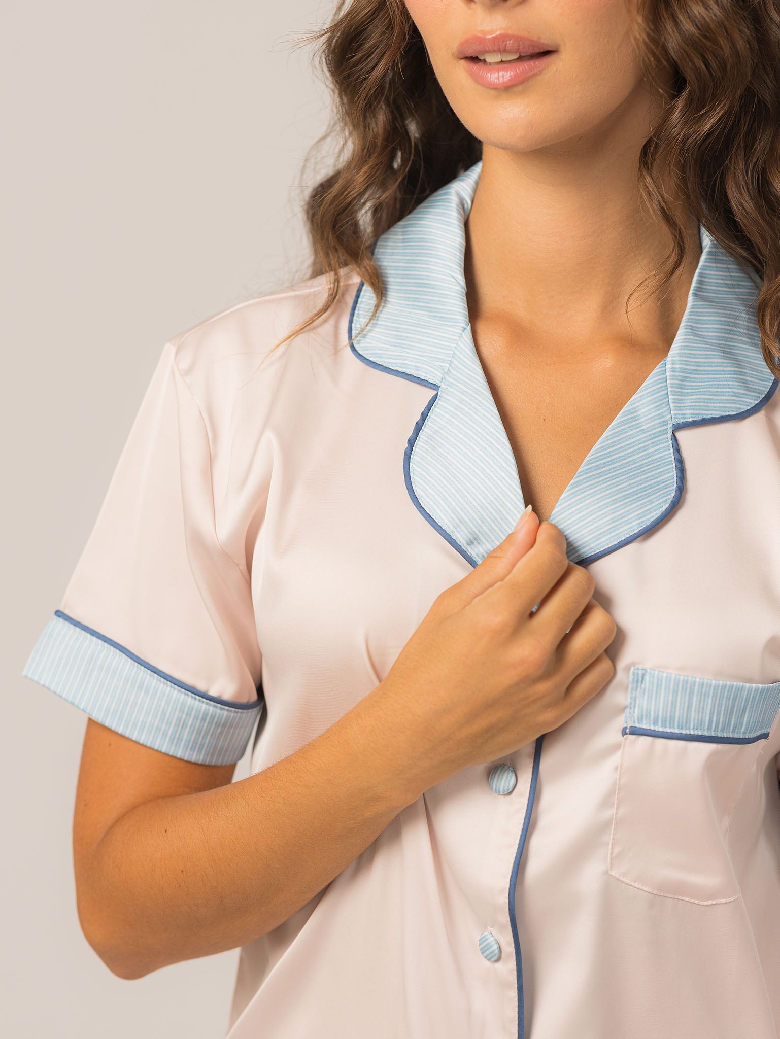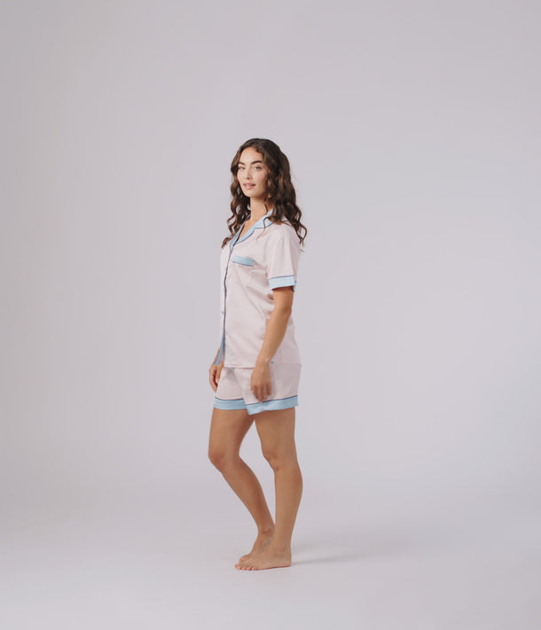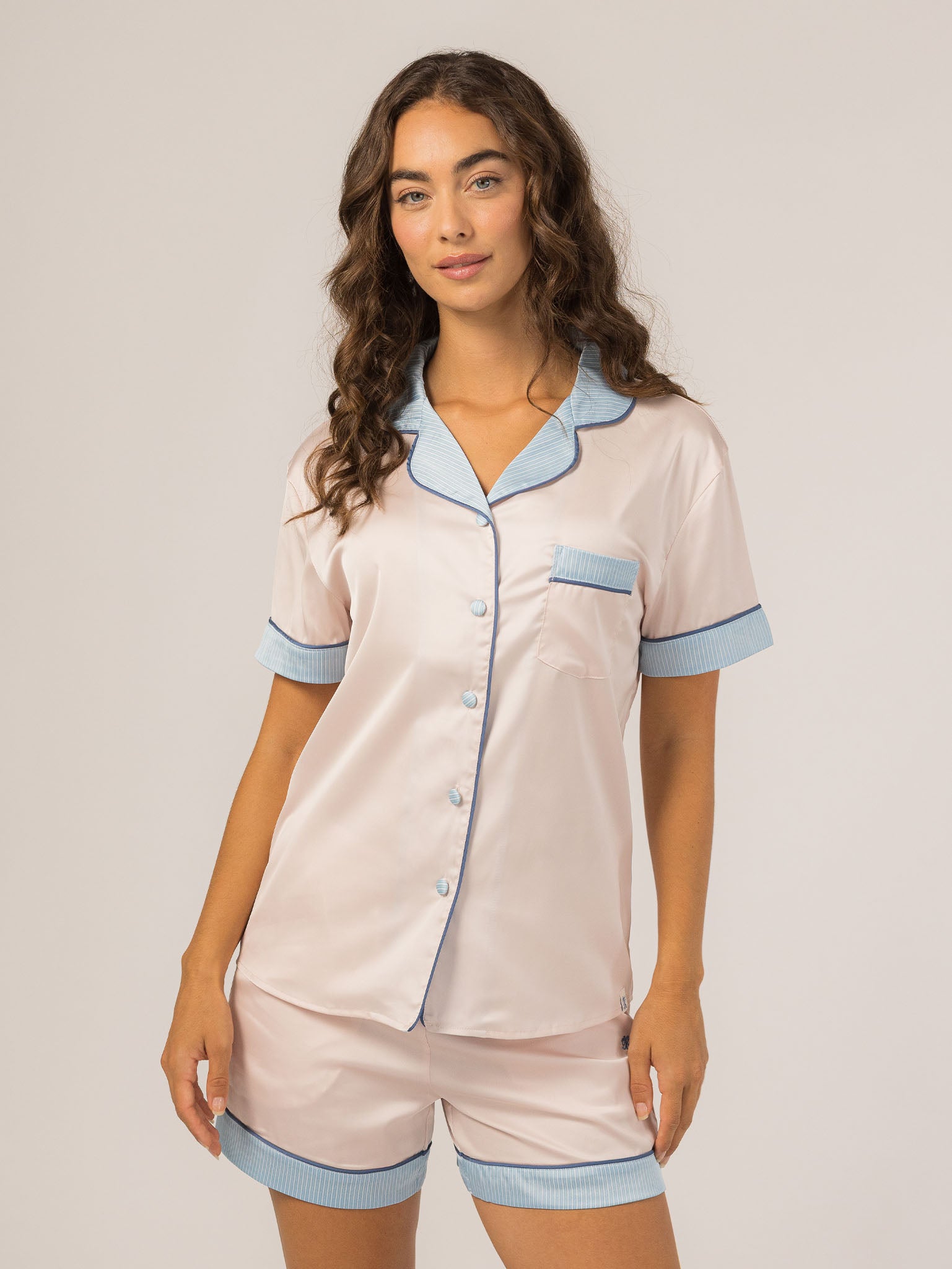 The Grace PJ Short Sleeve Set is my go-to for feeling polished and cozy. Crafted from our luxe, silk-like Grace fabric, it’s smooth, breathable, and beautifully draped. Featuring a short sleeve button-up top and matching shorts with contrast piping—this set brings a little glam to your everyday unwind. Effortless elegance, always. – Keleigh ♡