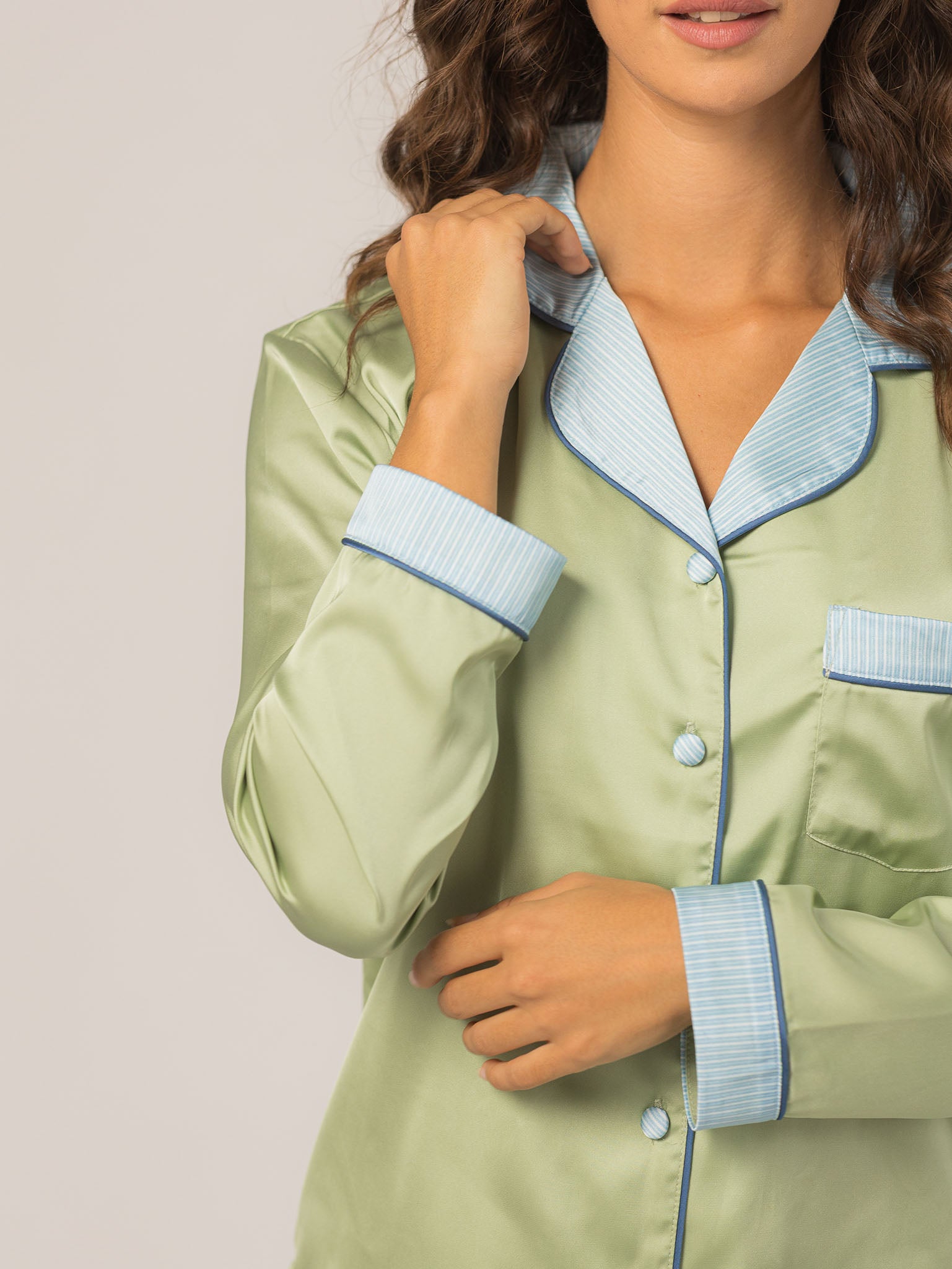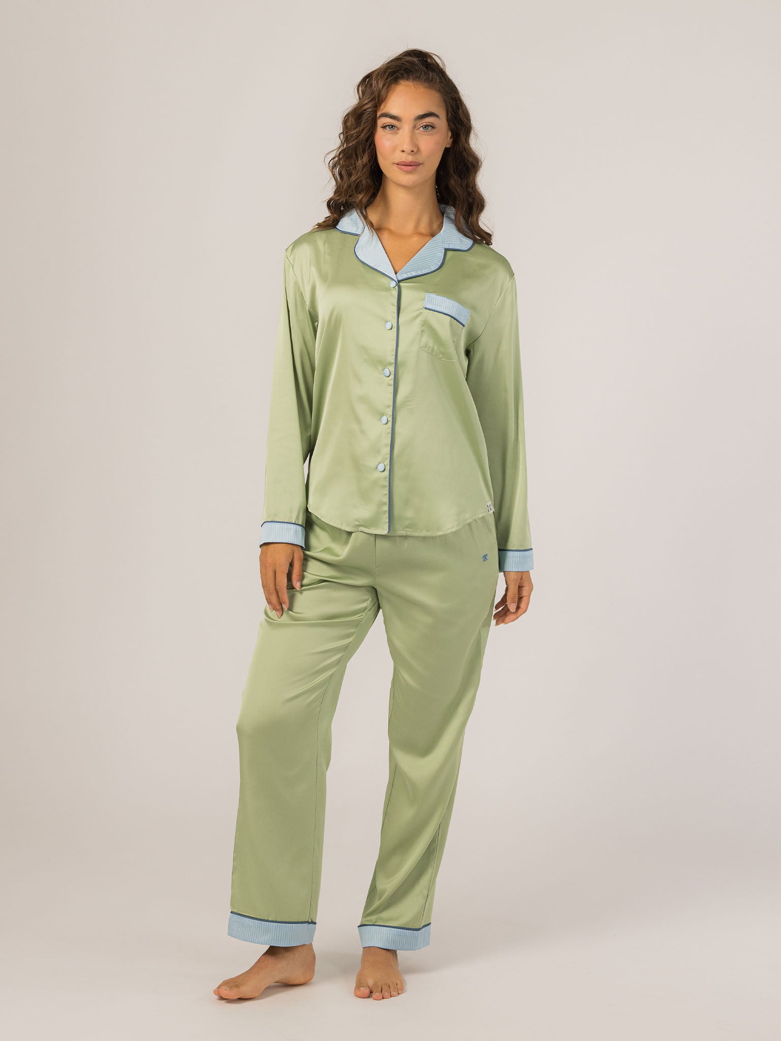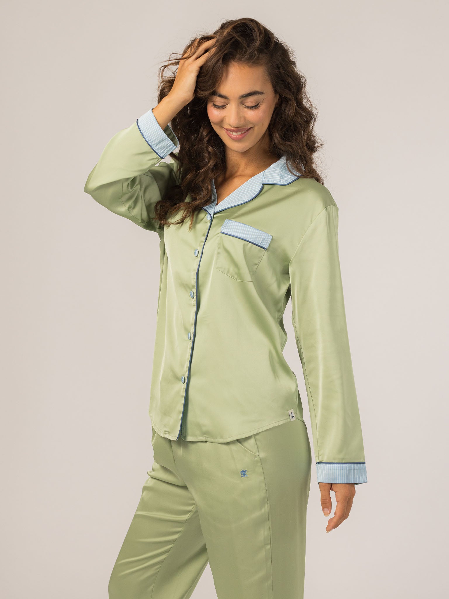 The Grace PJ Long Sleeve Set is my nighttime luxury essential. Made from our silky-soft Grace fabric, it has a smooth, elevated feel with just the right weight. With a classic button-up top, chest pocket, and straight-leg pants finished in contrast piping—this set feels like pure glam, even when you’re just lounging. – Keleigh ♡