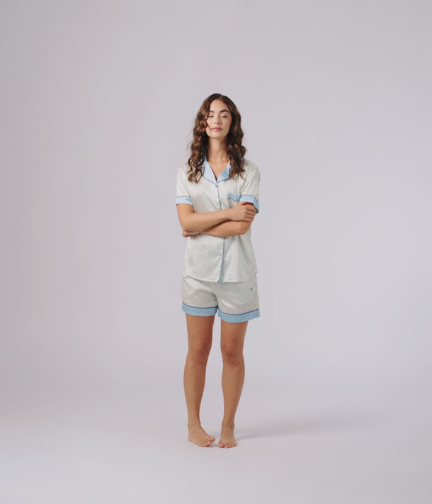 The Grace PJ Short Sleeve Set is my go-to for feeling polished and cozy. Crafted from our luxe, silk-like Grace fabric, it’s smooth, breathable, and beautifully draped. Featuring a short sleeve button-up top and matching shorts with contrast piping—this set brings a little glam to your everyday unwind. Effortless elegance, always. – Keleigh ♡