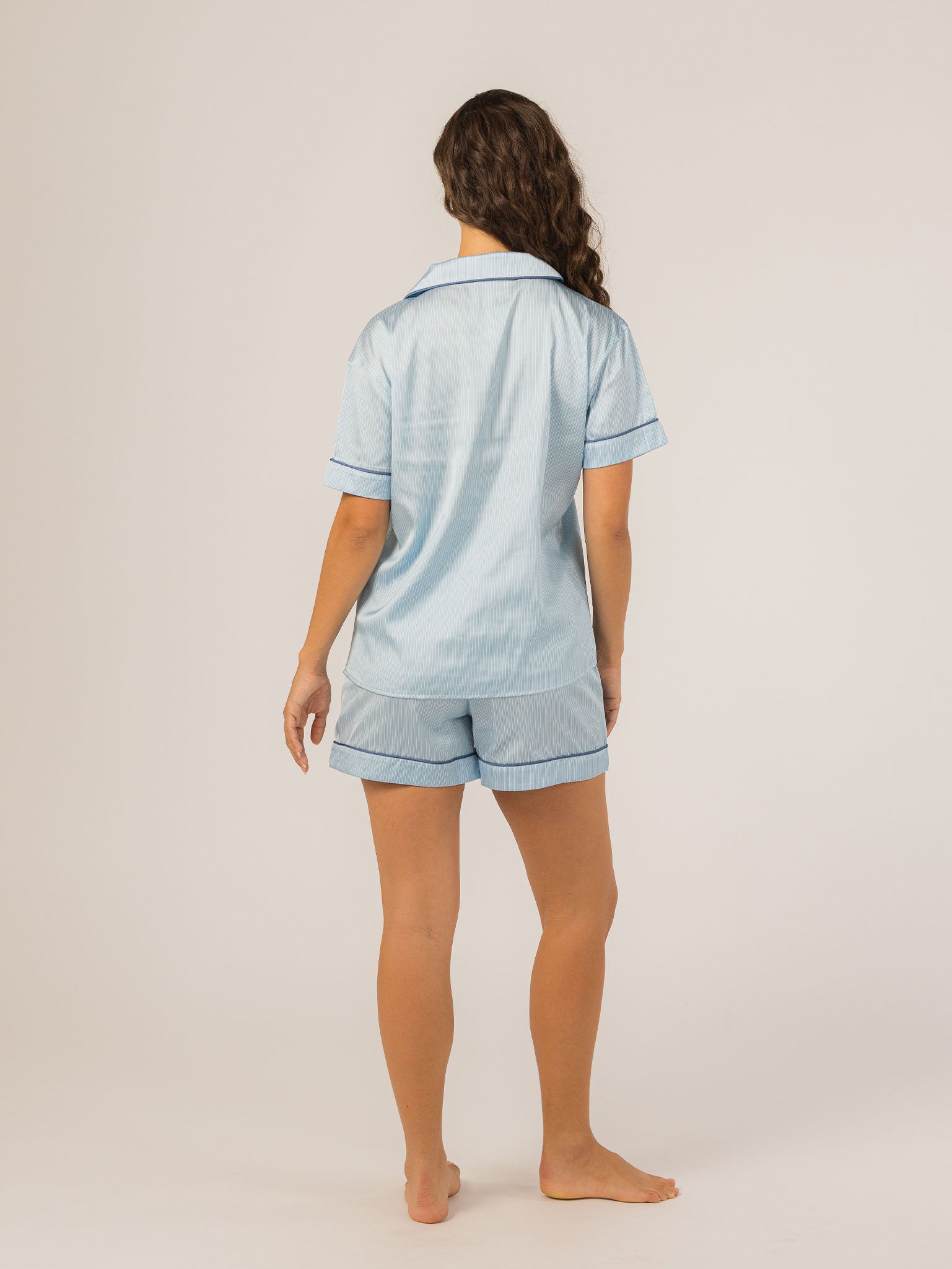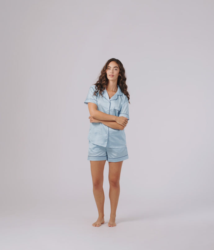 The Grace PJ Short Sleeve Set is my go-to for feeling polished and cozy. Crafted from our luxe, silk-like Grace fabric, it’s smooth, breathable, and beautifully draped. Featuring a short sleeve button-up top and matching shorts with contrast piping—this set brings a little glam to your everyday unwind. Effortless elegance, always. – Keleigh ♡