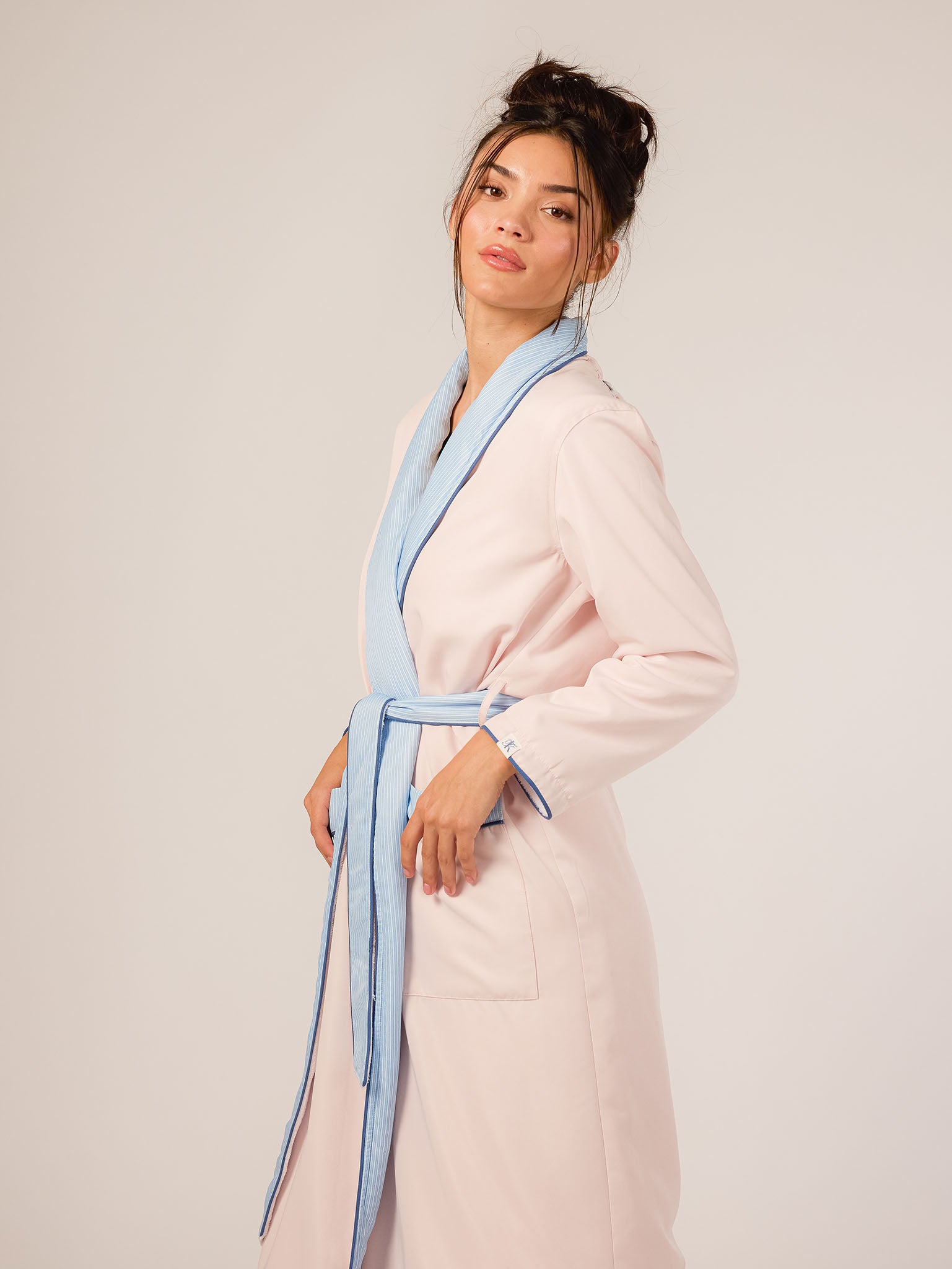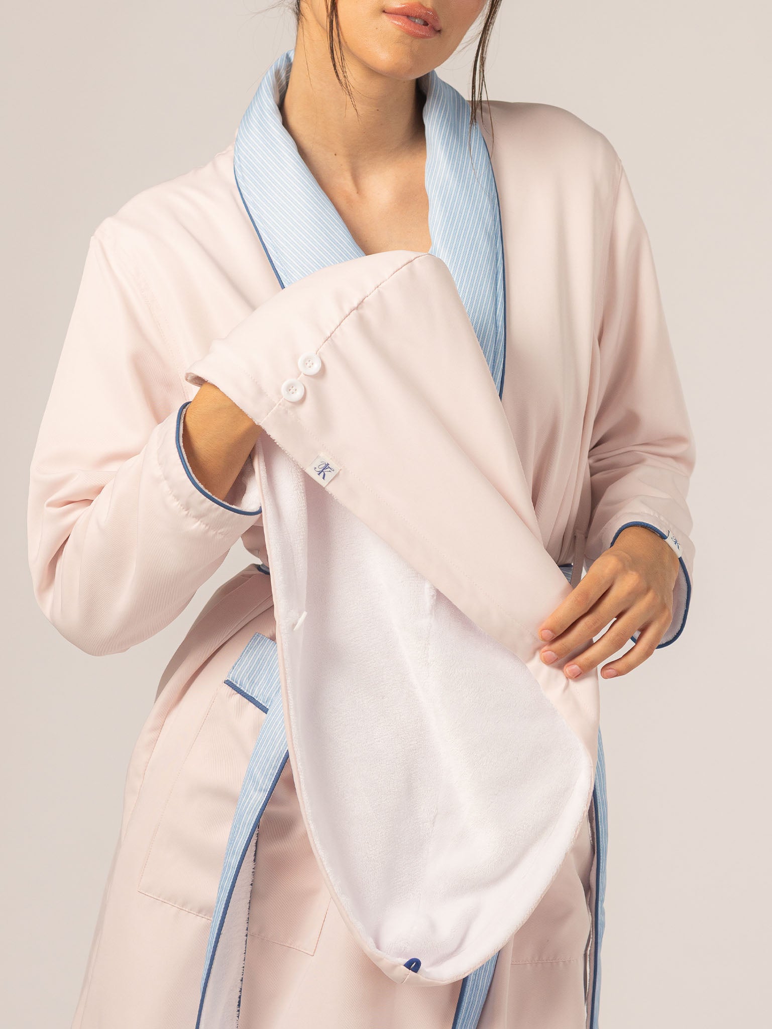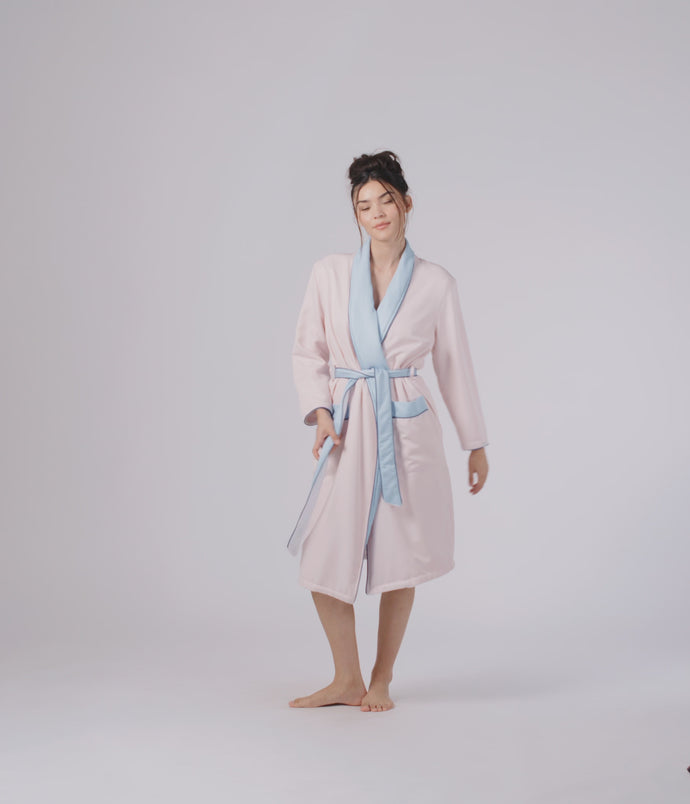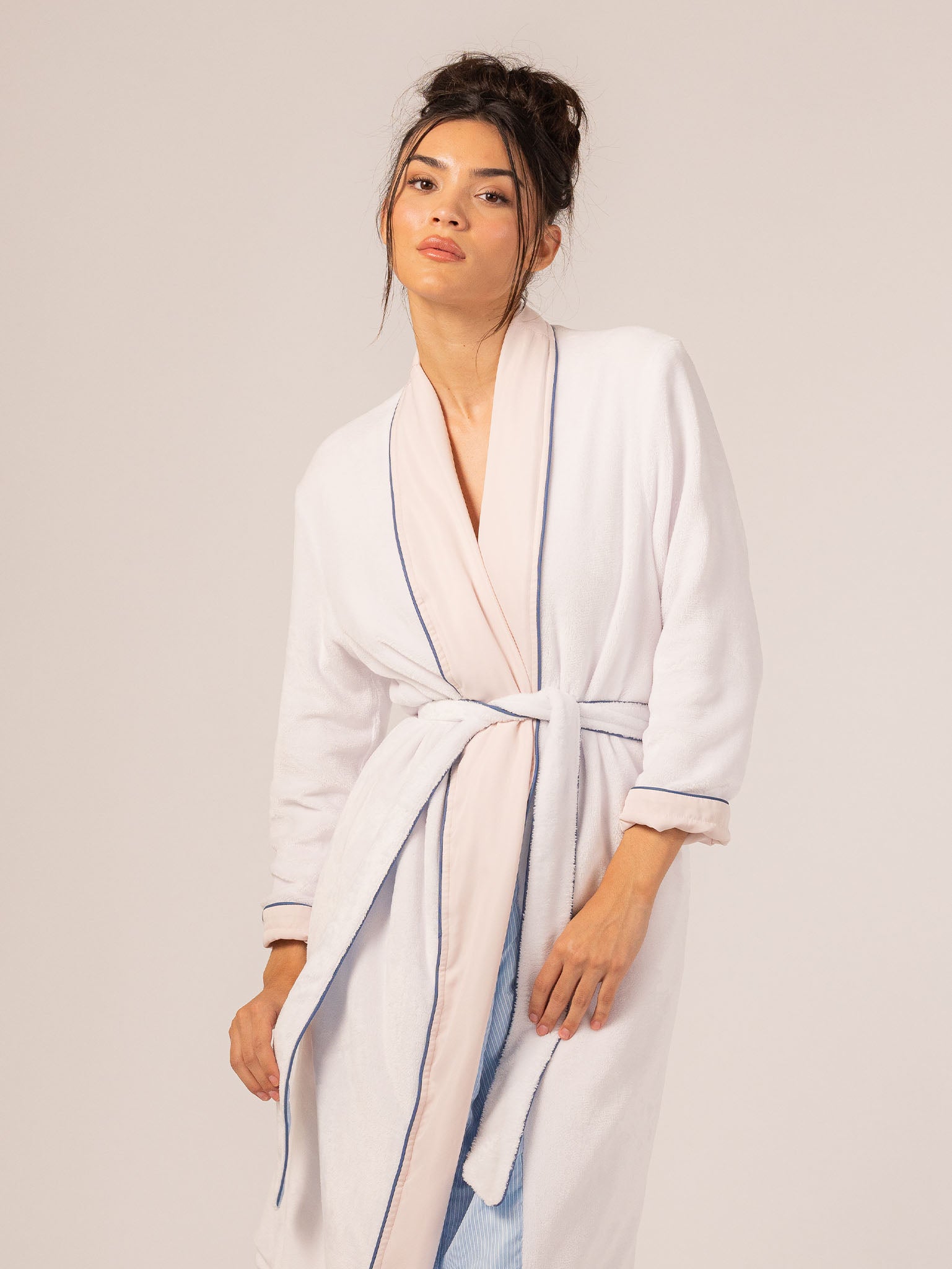 The Leona Reversible Robe is my everyday luxury must-have. One side feels like a silky down comforter, the other like the softest spa towel—so you always get the best of both worlds. With a chic pine-stripe lapel and cozy wrap tie, it’s the robe I never want to take off. – Keleigh ♡