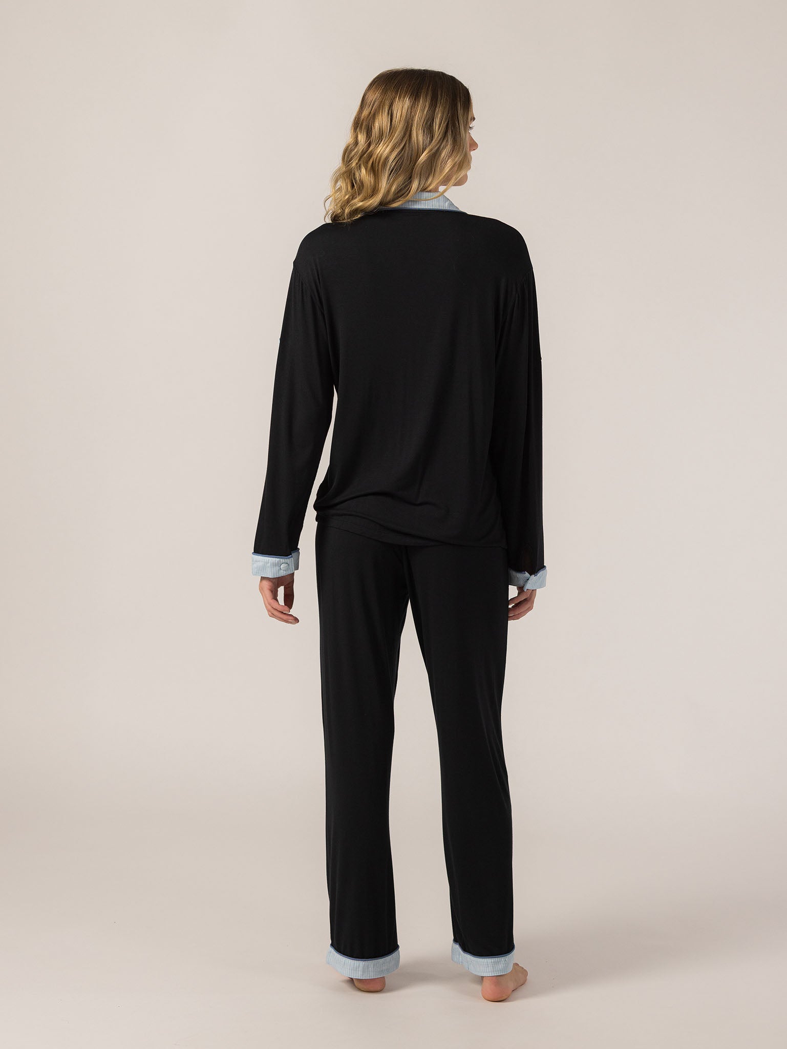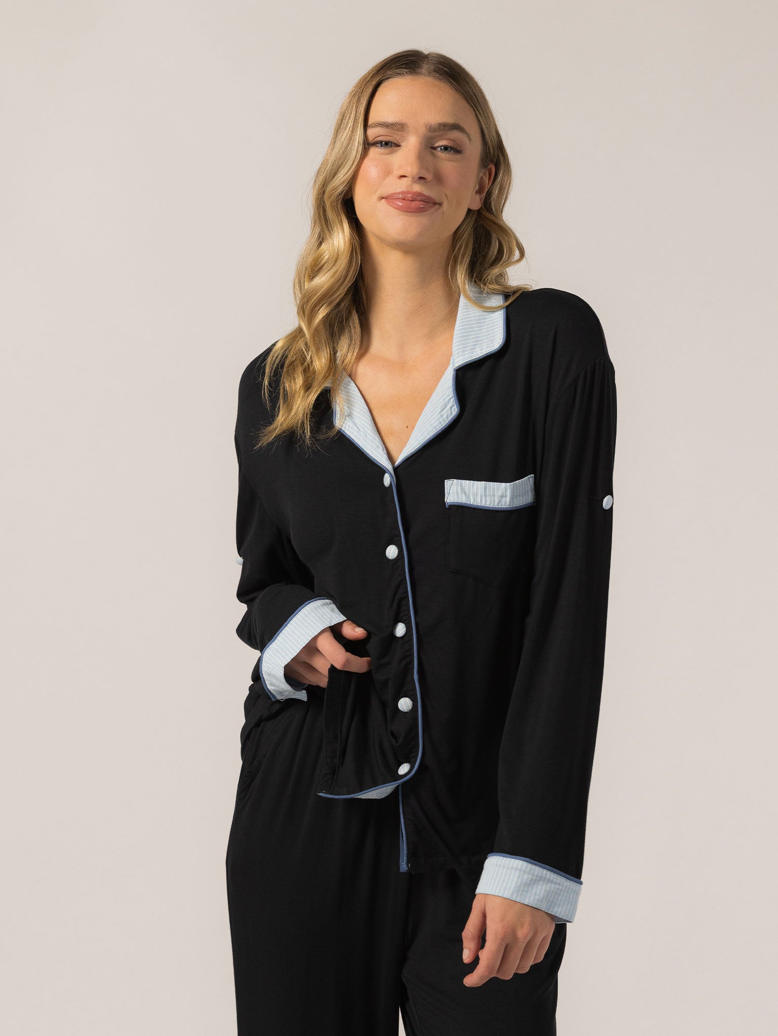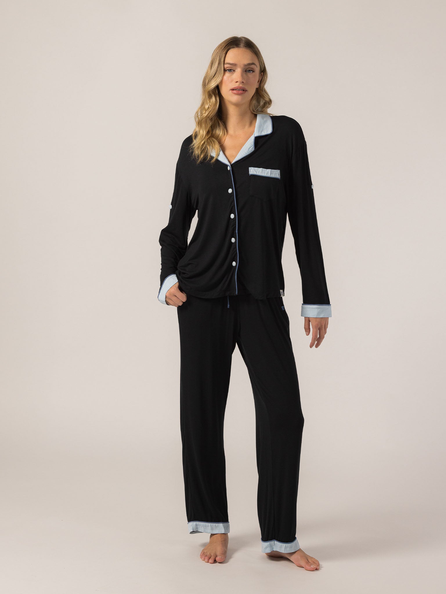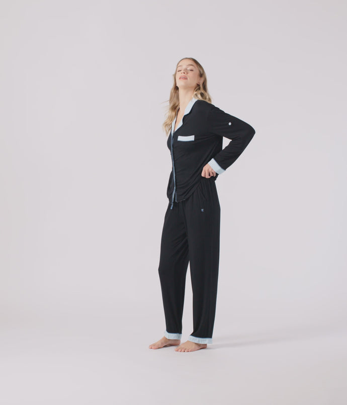Slip into effortless luxury with the Rose PJ Long Sleeve Set. Made from our signature ultra-soft Rose fabric, this breathable set features a classic button-up top with chest pocket and straight-leg pants with contrast piping and an adjustable waistband. It’s lightweight, cozy, and elevated—just how I like to unwind. – Keleigh ♡